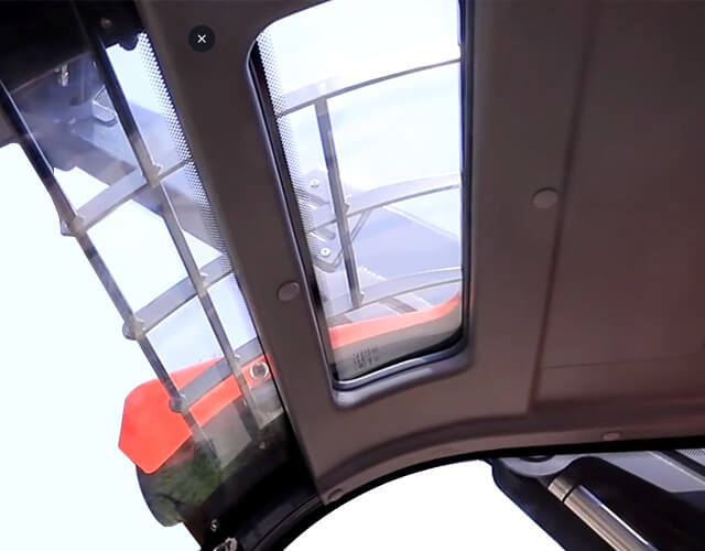 Die geräumige Kabine erfüllt die aktuelle europäische Maschinenrichtlinie hinsichtlich ROPS- und FOPS-Schutz und bietet viel Kopffreiheit sowie Bewegungsfreiheit für die Arme. Die Vollverglasung ermöglicht dem Bediener eine ausgezeichnete Rundumsicht über den gesamten Arbeitsbereich.